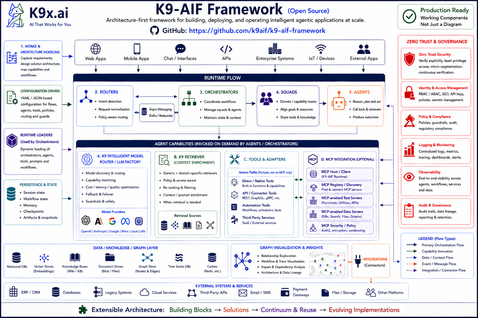 K9-AIF serves as the architectural foundation of the K9X ecosystem (pronounced "K-nine-X"). It provides standardized components including agents, orchestrators, routers, and governance constructs, enabling consistent design, extensibility, and governed execution across enterprise implementations.